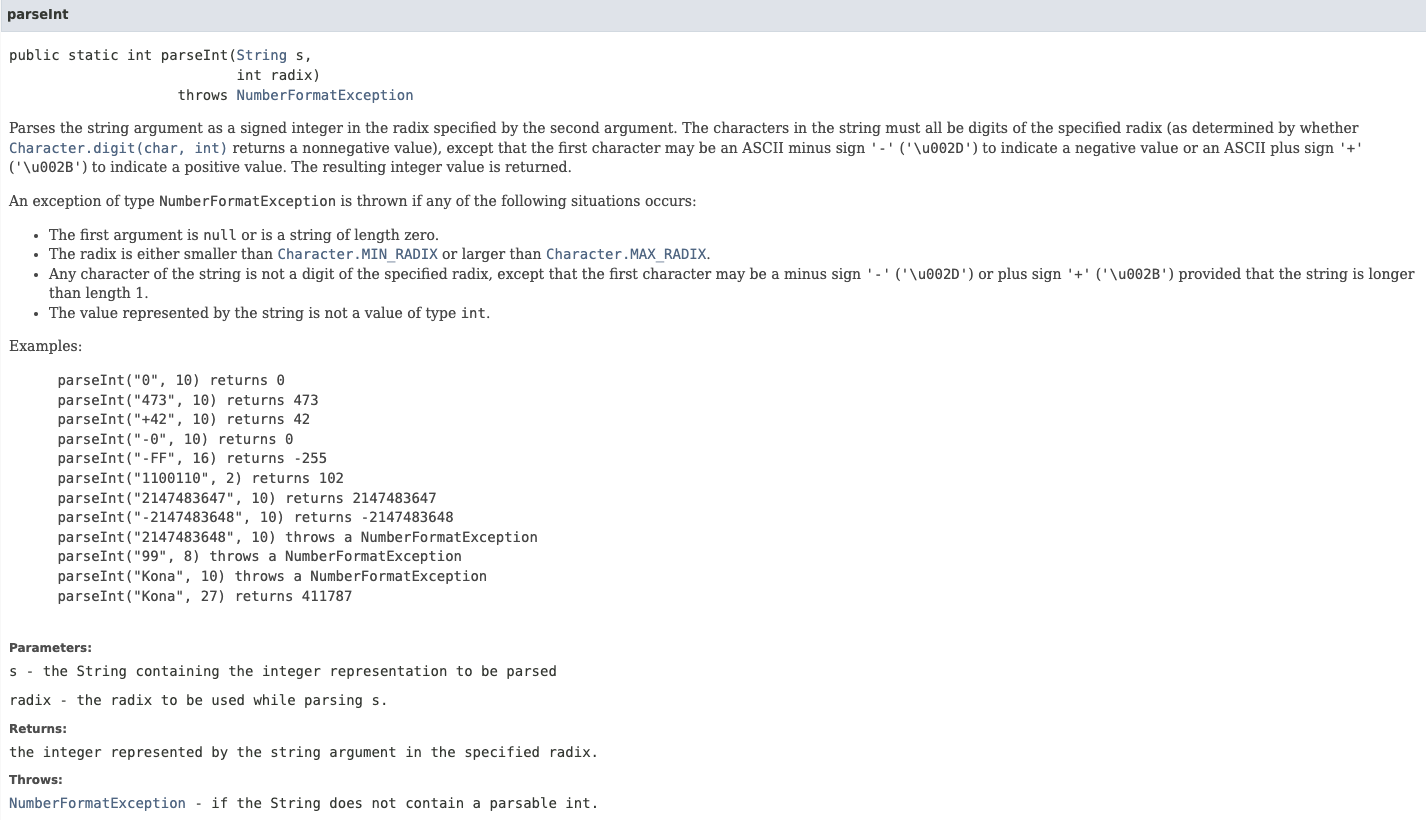 ๊ทธ๋ฆฌ๊ณ , ์ผ๋ฐ์ ์ผ๋ก ์ฌ์ฉํ๋ Integer.parseInt(s) ๋ ์ฌ์ค, ๋ด๋ถ์์ Integer.parseInt(s, 10)์ ์คํํ๋ค.