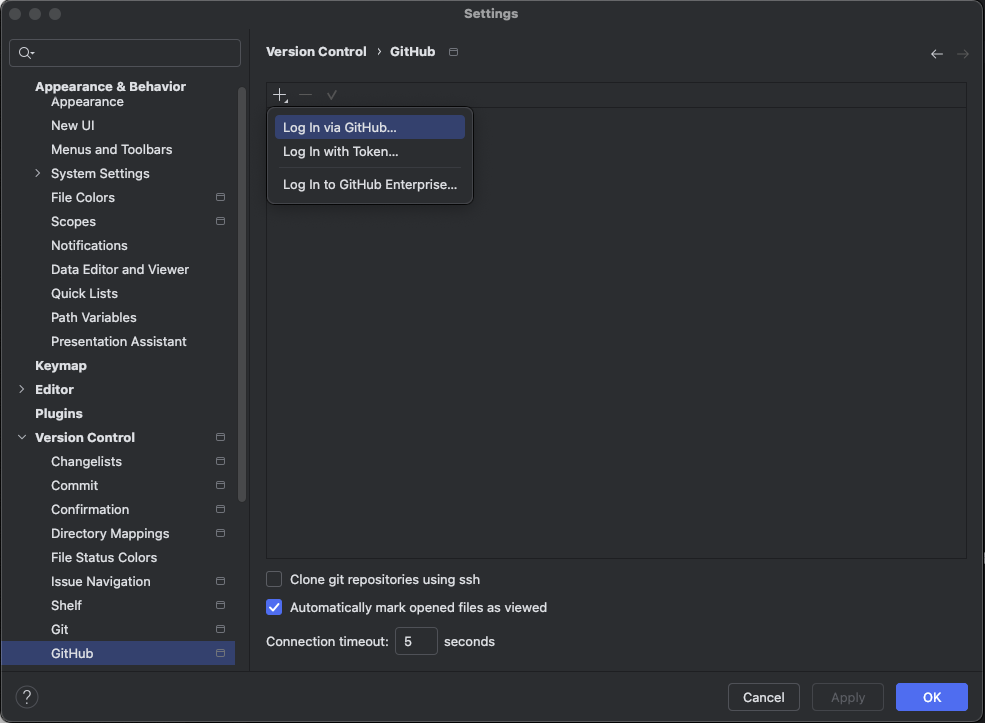 IntelljJ > Settings > Version Control > Github > [+] ์ ๋๋ฌ log in via Github...