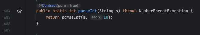 java.lang ํจํค์ง์ Integer.java ๋ฅผ ๋ค์ด๊ฐ๋ณด๋ฉด parseInt() ์ parameter๋ก String s, int radix ๋ฅผ ๋ฐ๋๋ค.
