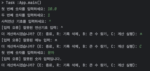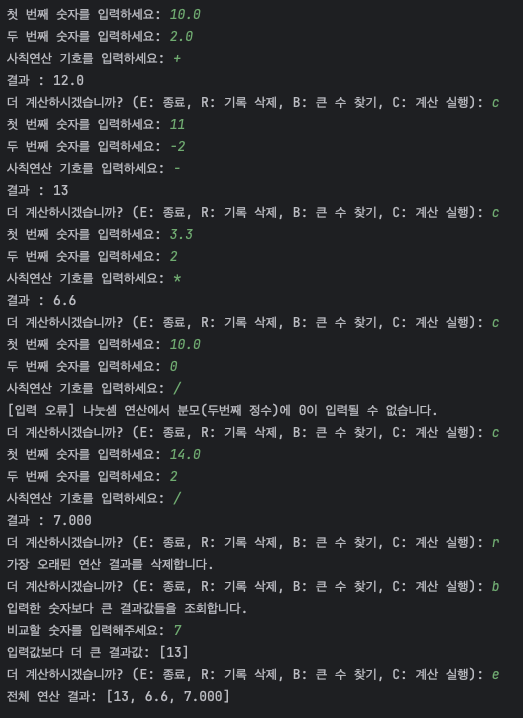 System.out.print("더 계산하시겠습니까? (E: 종료, R: 기록 삭제, B: 큰 수 찾기, C: 계산 실행): ");