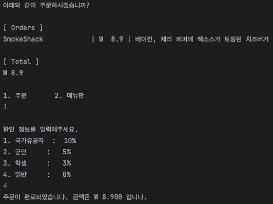 ์ฃผ๋ฌธ ์, ์ฌ์ฉ์ ์ ํ์ ๋ง๋ ํ ์ธ์จ ์ ์ฉํด ์ด ๊ธ์ก์ ๊ณ์ฐํ๋ discount ๋ฉ์๋ ๊ตฌํ