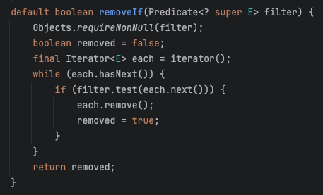 Collection์ด ์ ๊ณตํ๋ default ๋ฉ์๋์ด๊ณ , ํํฐ๋ง ์ญํ ์ ํ๋ ํจ์ํ ์ธํฐํ์ด์ค Predicate๋ฅผ ์ธ์๋ก ๋ฐ๋๋ค.