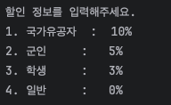 System.out.println("\n할인 정보를 입력해주세요.");