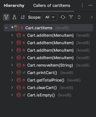 해당 필드, 메서드를 어디에서 호출하고 있는지 계층으로 표시하여 알려준다.