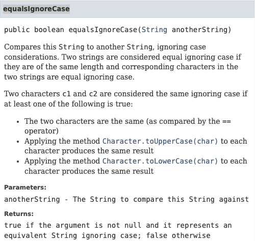 영문자를 입력받는 경우 두 문자열을 대소문자 구분없이 비교하고 동일하면 true, 다르면 false로 반환하는 메서드