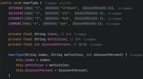 👉 UserType 에서 index를 관리하도록 수정하였다. 그리고 index로 UserType 상수를 반환받을 수 있는 메서드를 추가하였다.