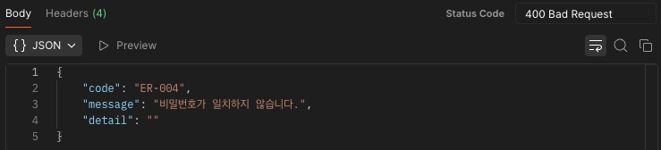 Status: 400 Bad RequestResponse Body: ErrorResponseDtoμ μ μλ μλ¬μ½λ, μλ¬λ©μΈμ§λ₯Ό JSON νμμΌλ‘ λ°νπ μ°Έκ³ μλ£