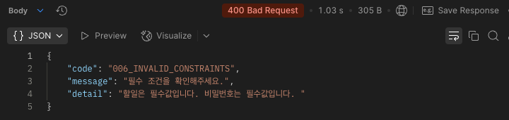 ์ด ๋ถ์ ๊ฐ์ฒด๋ ํด๋น ๊ฐ์ฒด์ ํ๋์ ์ค์ ๋ ์ ํจ์ฑ ์ ์ฝ ์กฐ๊ฑด์ ๊ธฐ์ค์ผ๋ก ๊ฒ์ฌ๊ฐ ์ํ๋๋ค.MethodArgumentNotValidException ์์ธ๊ฐ ๋ฐ์ํ๊ณ , Spring์ ์ด ์์ธ๋ฅผ ์๋์ผ๋ก ์ฒ๋ฆฌํ์ฌ 400 (Bad Request) ์๋ต์ ๋ฐํํ๋ค.