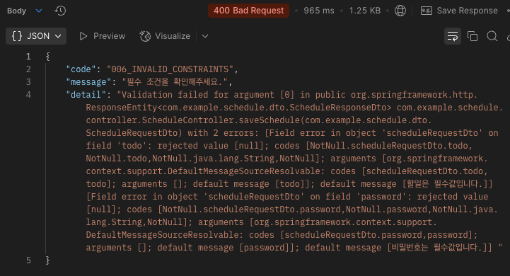 e.getMessage() ๋ฅผ detail ์ ๋๊ธฐ๋ฉด ๋ณต์กํ ์๋ฌ ๋ก๊ทธ๊ฐ ์ถ๋ ฅ๋๋ค. ์ฌ์ฉ์ ์
