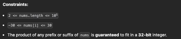 The product of any prefix or suffix of nums is guaranteed to fit in a 32-bit integer.