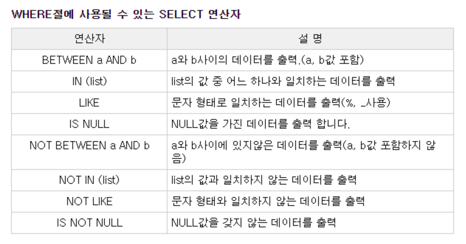 where 조건 절에서는 " 비교, 범위, 집합, 패턴, NULL, 복합조건" 등을 다룬다.