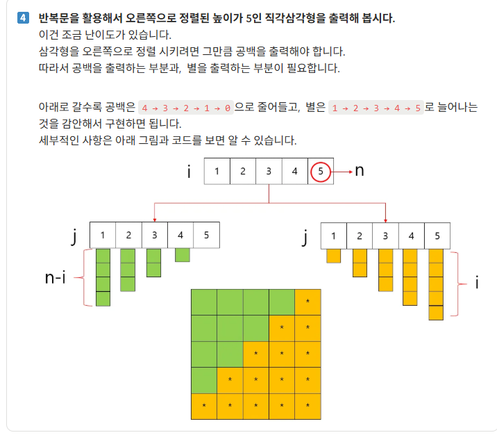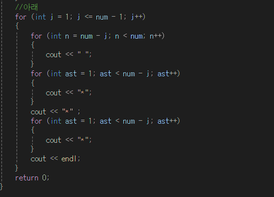 오른쪽으로 별을 출력하는 코드를 분석해보았다. 높이가 5라고 적혀있는게 사실은 코드줄이 총5개인것이다 그래서 n=5 라고 정해놓았을때 1부터 5까지 가야함으로 for문을 이용해서 i = 0 ; i < 5 이렇게 조건식으로 세우면 된다. 후에 endl;을 끝에 달아주면 총5줄의 문단이 생긴다 이제 거기서 1 2 3 4 5 로증가하는 별과 4 3 2 1 0 으로 줄어드는 공백이 필요하다 순서상으로 봤을때 첫번째 줄이 한번 실행될때 공백은 총4번 별은총 1번이 실행되어야 하는것이다 따라서, 처음선언한 for문 안에 위치하여야 하고 다시 거기서 반복을 돌아야한다. 공백은 줄어들어야 하는것이기때문에 for(int j = n - i ; j > 0) 이런조건식이되고 반대로 별은 늘어나야하니까 처음for문과 같은형태가 된다 그렇게 하게되면 오른쪽과같은 모습이 출력되게 된다. 이를 응용해서 도전을하고싶어서 다이아몬드 찍기에 도전을했는데,