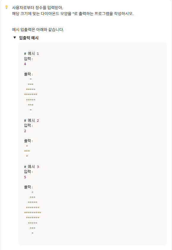 정수를 입력받아서 다이아몬드를 출력하는 구조이다. 일단 처음 패턴을 분석해봤을때 4를 입력하면 위 아래로 동일한 부분이 3 개 3 개 출력이된다 때문에 위랑 아래로 나누어 쪽이나 아래쪽에 한줄씩만 더 추가하면 된다고생각했고 또 위에서 왼쪽과 오른쪽으로 나눠야 한다고생각해서 나눈다음 공백과 별을 출력하는 수업내용이 생각이나서 순서대로 for문으로 배치했다.