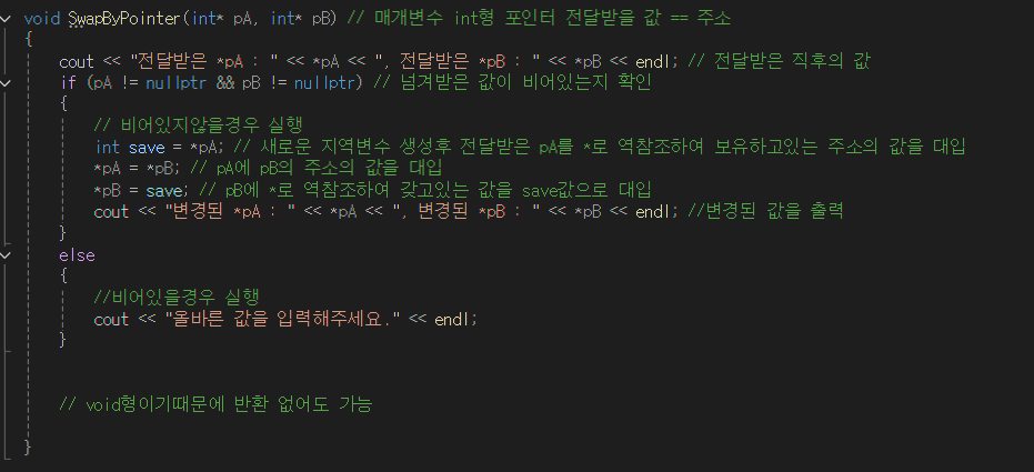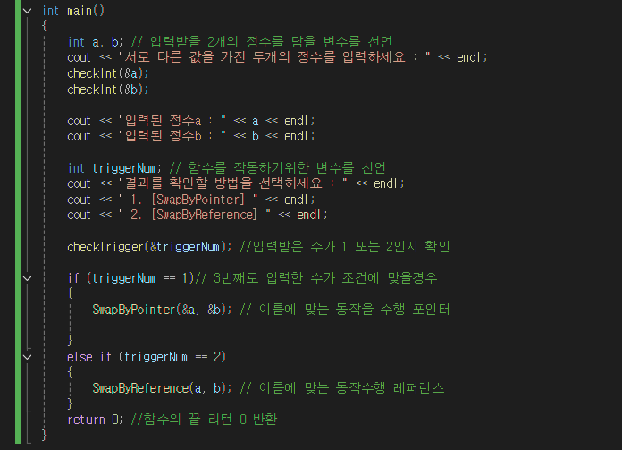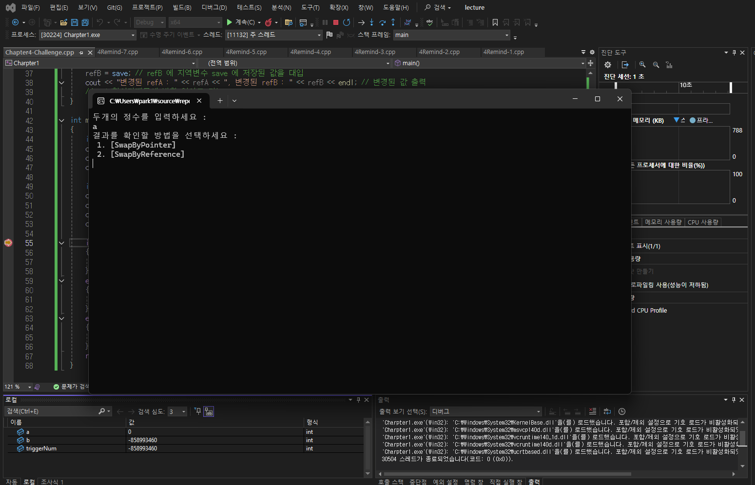강의 내용을 바탕으로 포인터와 레퍼런스를 이용하여 두 값을 교환하는 함수 만들기를 진행하였다.