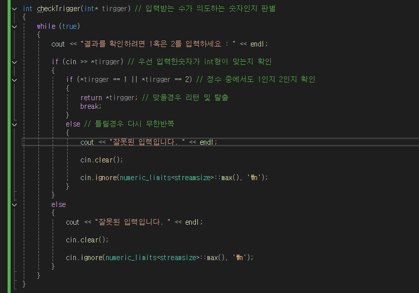 최종적으로 구현한모습이다. 이로써 발생할 수 있는 예외는 전부 처리했다고 생각한다 또 문제가 생기면 고쳐봐야겠다. 결과적으로 오늘은 cin의 시스템을 이해하고 잘못된 입력을 받았을시 프로그램을 종료시키는것이아닌 이어서 동작하는 방법을 터득했다.