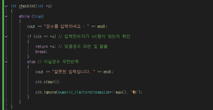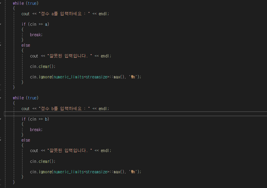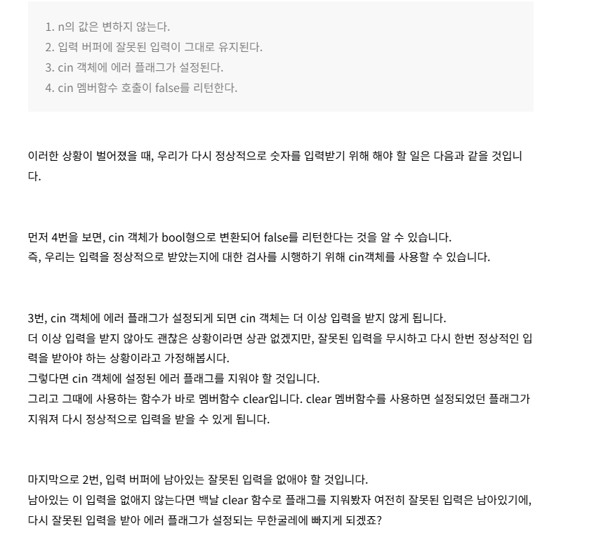 해당내용을 알 수 있었는데 정리하자면, 잘못된 입력을 할시에 false 를 반환한 다음 그 잘못된 입력이 cin 입력버퍼에 그대로 남아있다는 것이다. 따라서 잘못된 입력을 받은다음 재입력을 시키는 동작을 하고 싶으면 입력버퍼를 지우고 다시 입력을 받는 동작을 무한 반복하게끔 해줘야 한다라는 사실을 깨달았다.