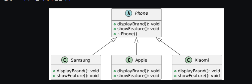 virtual을 사용하여 순수가상함수로 이루어진 클래스 Phone을 만들어주었다. 다음으로 main 으로 넘어와서 추상클래스를 포인터 타입의 배열로 선언하여 상속클래스들의 객체를 저장해주어야하는데