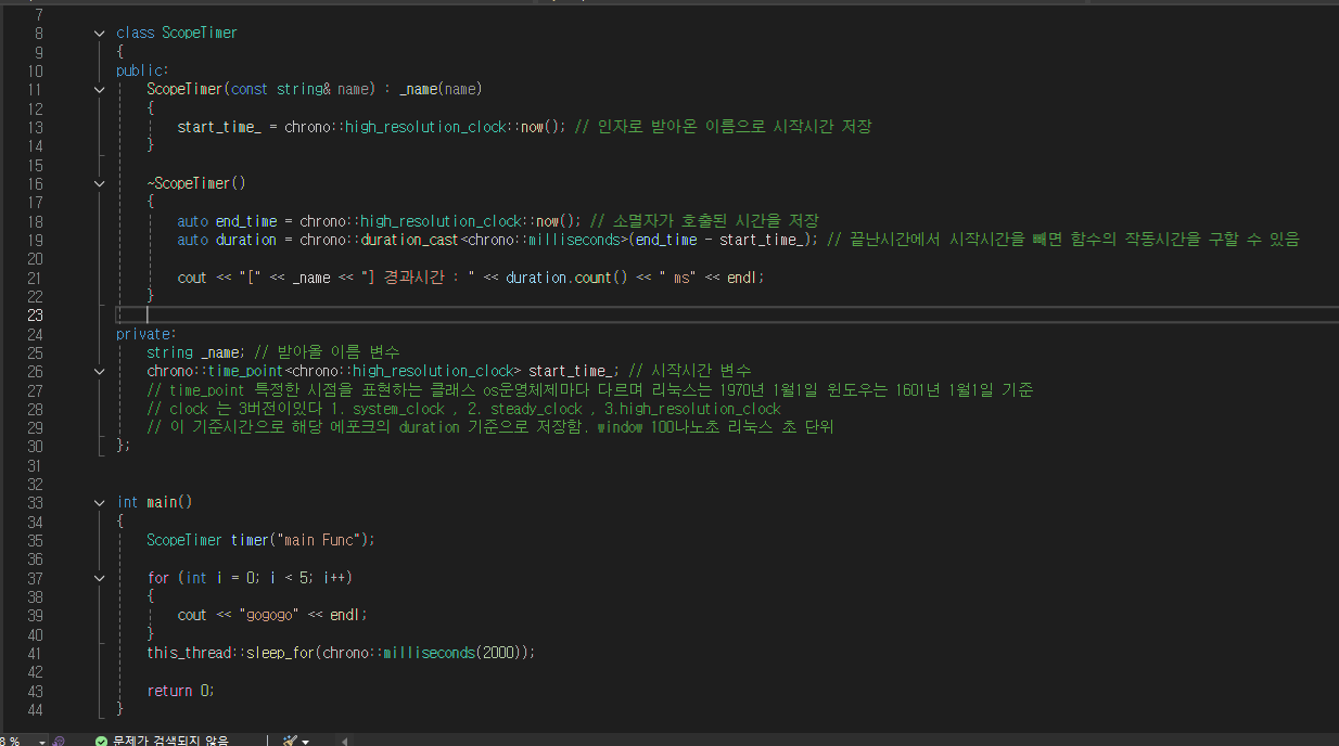 그렇다면이제 배운것을 토대로 ScopeTimer 클래스를 만들어 클래스 멤버함수를 통해 특정 스코프의 경과시간을 측정할 수있는 코드를 구현해야한다 여기서 우리가 사용하려는 클래스 안에 멤버함수가 RAII 기법으로 구현이 되야한다는말이다 RAII 기법이란 자원 관리의 책임을 위임한다는 뜻이라고 한다 사용자가 직접 메모리를 할당하고 해제하는게 아닌 메모리가 있으면 범위를 벗어나게 되면 자동으로 해체되어야한다는 말이다. 여기까지는 이해를 했으나 구현하는 방법 자체는 모르기때문에 AI의 도움을 받아서 구현했다. chrono STL 을 사용하여 스코프타이머 함수를 구현했는데 굉장히 어려운 내용이많았다.