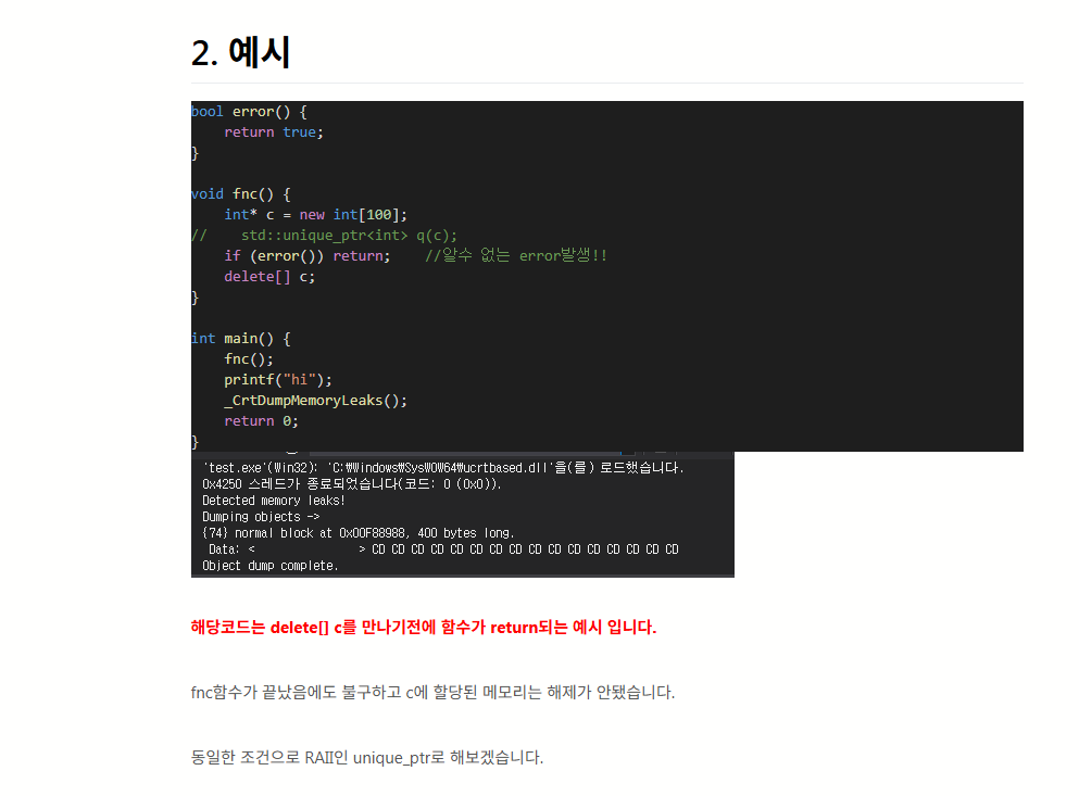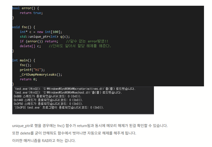 위 내용과 예시를 보면서 정리하자면, 스마트포인터를 활용하여 동적메모리를 자동으로 해제하게 해주는 기법이라고 한다. 즉, 이러한 구조로 이루어진 매커니즘 자체를 RAII 기법이라고 한다.