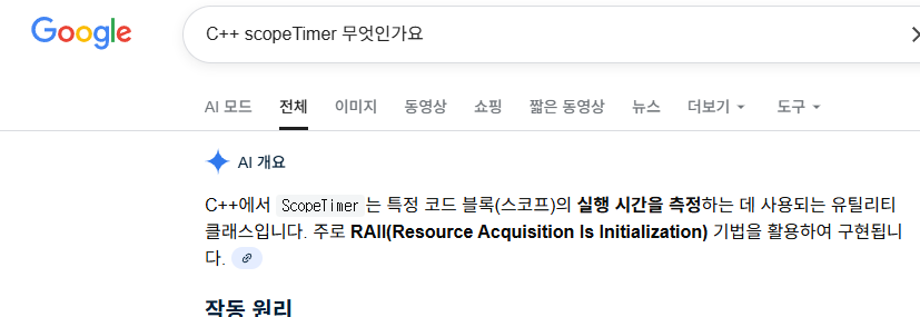 c++ 에서 스코프는 함수의 범위라는것이 생각났다 즉 scopeTimer 란 어떠한 함수가 있으면 그함수의 작동시간을 측정하는 함수였던 것이다. 이 함수가 RAII기법을 활용하여 구현을 한다는데 RAII 기법이 도데체 뭘까 싶어서 검색을 또 해보았다.