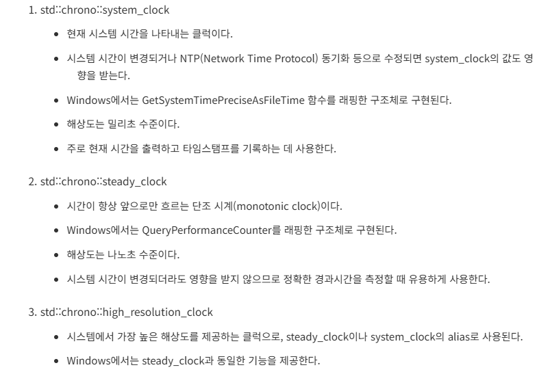 코드의 맥락은 이러하다. 생성자가 호출이되면 시작시간을 저장하고 소멸자가 호출이되면 끝시간에서 시작시간을 빼서 총 작동시간을 계산하는 방식이다. chrono::high-resolution_clock 이것은 clock 구조체 라고 하는데 총 3가지가있다.
