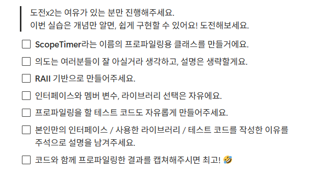 문제를 읽는 것 조차 어려웠다 ScopeTimer 라는 이름의 프로파일링용? 클래스를 만들어야하는데