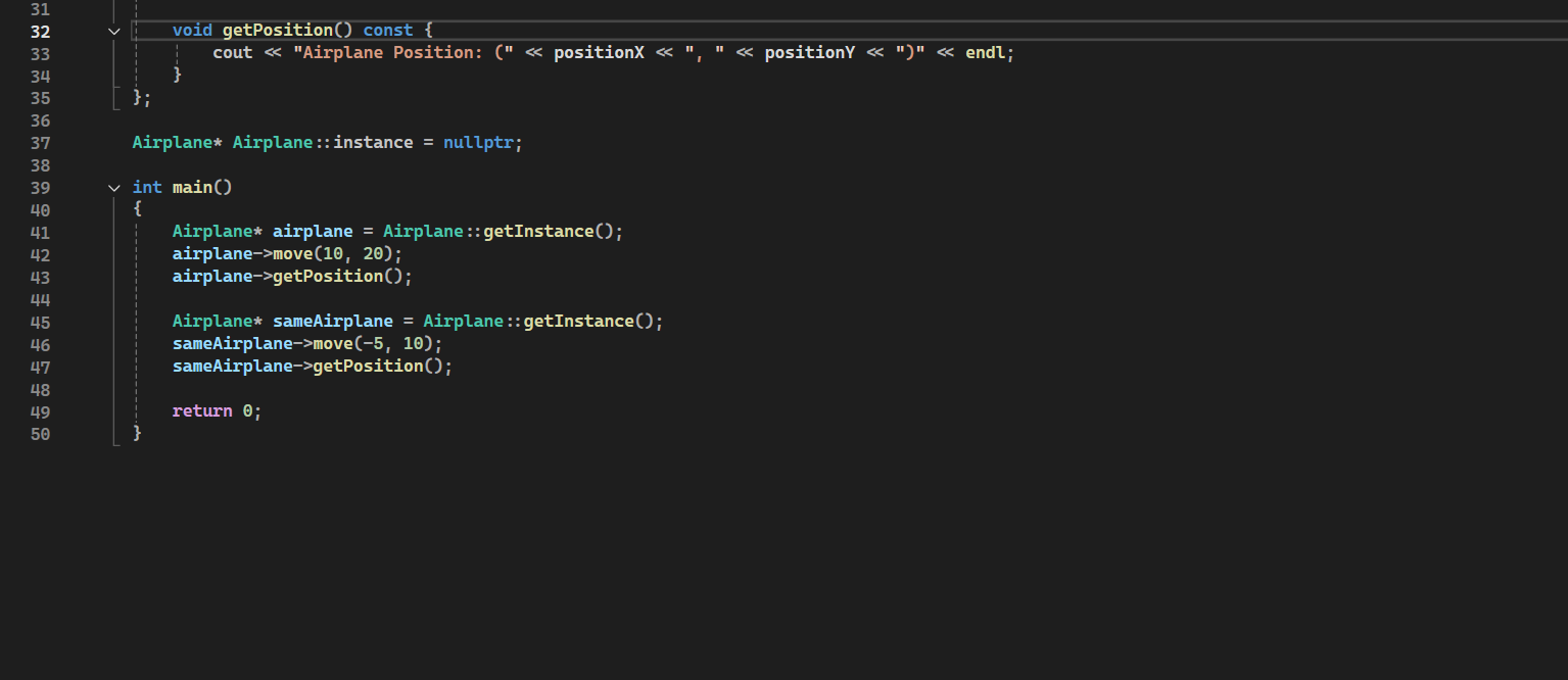 스태틱 멤버 변수로 생성한 instance의 중복 초기화 방지를 위해 main 함수 위 클래스 외부에 초기화 해당 초기화는 static 멤버 특성상 한번만 호출됨 nullptr로 초기화를 한 이유는 프로그램 실행시 객체가 단 하나만 존재해야하기 때문에 getinstace 가 여러번 호출이되어도 nullptr 일 경우에만 새로 생성하게됨. 때문에 한번 이후 또 호출할경우 변수 이름이 다르더라도 동일한 객체를 가르키고 있다는 것을 알 수 있음.
