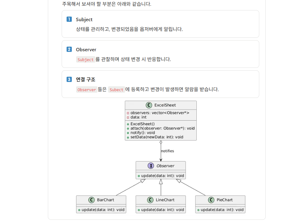 이때 해당 클래스들을 문서에 장착하여 문서에서 특정 값을입력할시 옵저버를 통해 모든 기능들이 작동하는 구조이다. ex) 엑셀차트에는 바를 출력해주는 바차트 선을출력해주는 라인차트 %를 달아주는 파이차트가 있다고 가정했을때 해당 기능을 가진 옵저버 인터페이스를 상속받는 클래스들을 각각 만들어 메인엑셀에 붙이고 메인엑셀에서 값을 출력시 옵저버를통해 모든 기능을 동일하게 작동시킬 수 있음