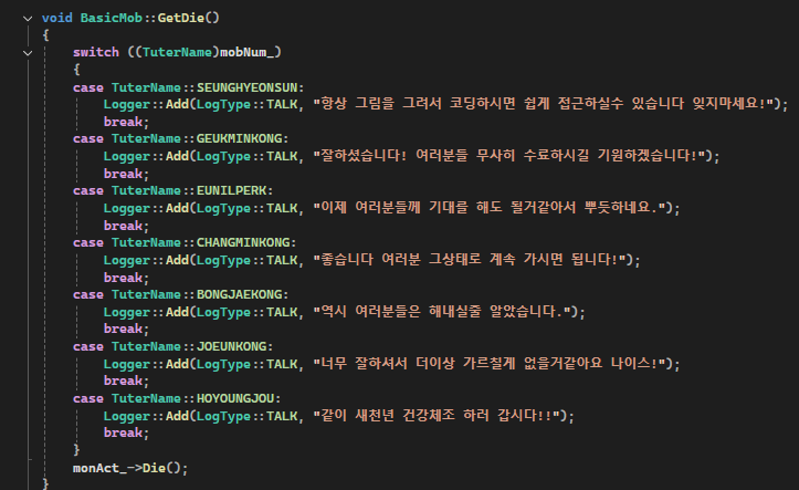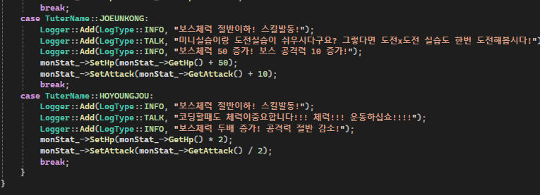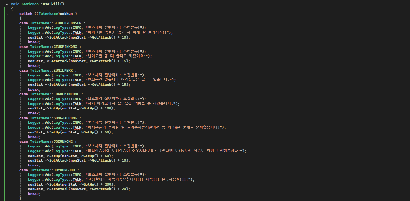 해당번호로 다시한번 초기화 해준다 이후 useskill 함수같은 몬스터별로 각각 다른 상호작용을 원하는 함수 호출시 스위치 enum 을 사용해 등록되어있는 몬스터에게 맞는 함수가 호출되도록 구현했다. 이후 알맞게 작동한다면 해당 구역내에서 스킬세부구현을 해주고 대사를 출력하게 구현해주었다.