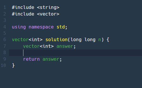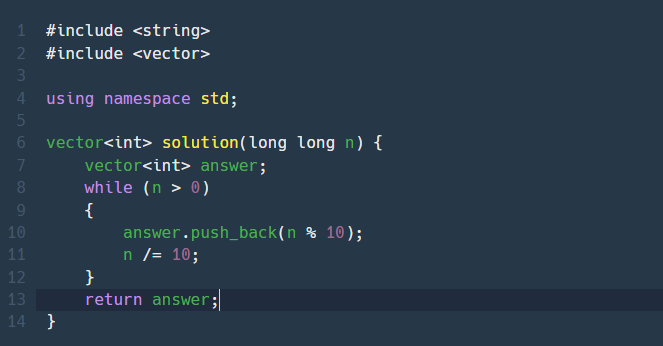 의사코드 구현 : 예제에서 12345가 주어지면 5,4,3,2,1 로출력이 되어야한다 우선 자릿수를 구하는 방법을 생각해보면 주어진수를 10으로 나눈 나머지를 하면 마지막 자릿수가 나오고 주어진 수의 10으로 나눈 몫을 구하면 마지막자리 나머지를 뺀 수가 남는다. 즉 주어진수의 10으로나눈 몫이 0보다 클때까지 반복하면 자릿수만큼 반복을 하게되고 주어진수를 10으로 나눈 나머지를 순서대로 벡터에 넣어주면 된다.