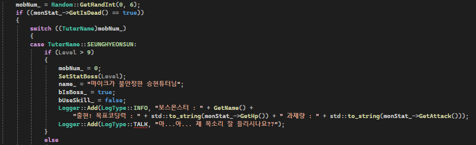 클래스내에 멤버 변수로 mobNum_ 을선언해주었고 enum 클래스로 몬스터 분류 사용을 이용해 몬스터가 스폰된경우