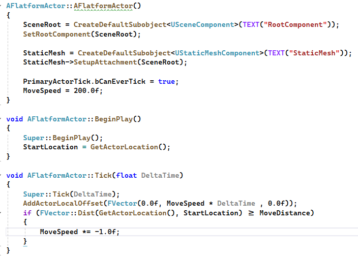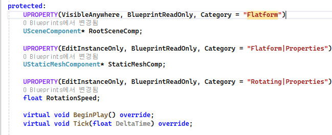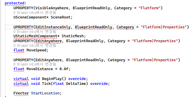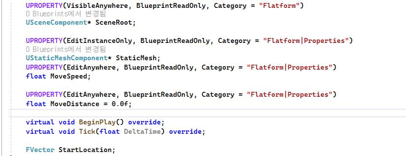 StaticMesh 컴포넌트의 경우 같은동작을 하는 엑터를 여러개 배치 할 경우의 수를 대비해 인스턴스상에서 수정이 가능하도록 매크로 선언MoveDistance 멤버변수 플랫폼마다 이동하는 거리를 다르게 설정해 줄 수 있게 EditAnywhere 선언MoveSpeed, RotationSpeed 멤버변수 플랫폼마다 이동하는 거리를 다르게 설정해 줄 수 있게 EditAnywhere 선언