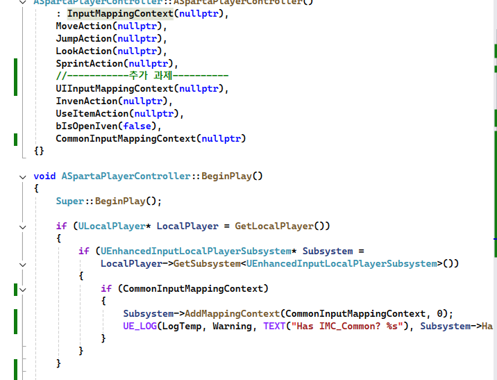 구현하면서 어려웠던점 : 캐릭터 클래스에서 컨트롤러와 향상된 인풋시스템을 직접적으로 Cast하는 개념을 이해하는데 어려웠고, BindAction과 실제동작구조를 알지 못했던탓에 어떤방식으로 캐릭터가 이동을하고 점프를 하고 실제동작을 파악하는데 많이 어려웠다. 추가강의를 통해 직접 c++ 클래스에서 바인딩하고 사용해야한다는것을 배웠을때 상당히 많이 이해해서 직접적으로 구현해볼 수 있었던 것 같다.