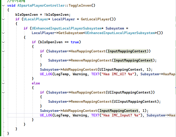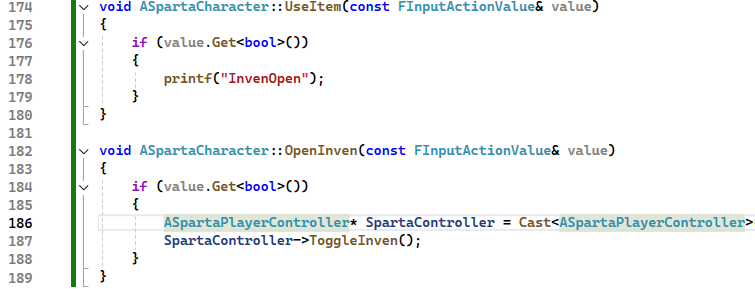UseItem 에는 아이템 사용을 알리는 문구를 출력하게 해주었고 OpenInven에선 PlayerController 에 구현해놓은 컨트롤러 교체함수를 직접 호출해주어야하기때문에 다시한번 이 함수내에서 컨트롤러를 직접 캐스팅한다음 함수를 호출해주었다.