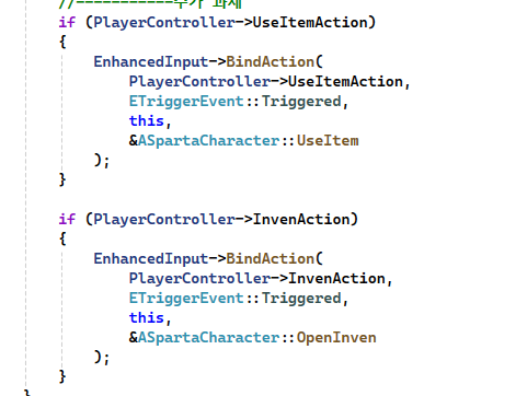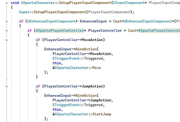 SetupPlayerInputComponent 함수 내부에서 EnhancedInputSystem 을 사용하기위해 캐스팅을 해주었고 마찬가지로 플레이어 컨트롤러 또한 캐스팅을 해주었다 캐스팅을 하는 이유는 변수에 보다 안전하게 접근하기위해서인데 포인터주소로 접근을 할 경우 문제가 생길 수 있다. 이후 캐스팅 조건문을 통과하게 되면 컨트롤러에 직접 구현해놓은 IA를 직접 호출하여 키를 바인딩해주고 해당키가동작하면 실행될 함수를 콜백해준다