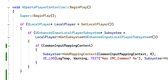 PlayerCharacter 클래스에는 언리얼에서 기본적으로 제공하는 이동 로직이 담긴 SetupPlayerInputComponent라는게 존재 한다는것을 알았다. 플레이어캐릭터가 가진 해당 함수에 내가 등록해놓은 IMC 들을 직접적으로 추가해서 바인딩을 해주어야 내가원했던 동작들이 가능하다는것이다. 해당내용을 공부한 후 방금 구현하려했던것을 다시 도전했다.