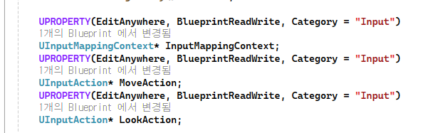 PlayerController C++ 에서 EnhancedInputMapping 들을 등록해야하기 때문에 필요한 변수 생성 후 생성자에서 안전성을위해 초기값 nullptr 대입