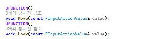 const FInputActionValue& : 언리얼에서 제공하는 구조체 데이터로 InputAction 의 값을 받아올 수 있음 받아온 값은 변하지않아야하기때문에 const 선언 및 구조체는 데이터가 커서 &연산자 사용
