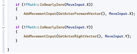 Move 함수구현 : Controller 유효성 검사, InputAction 을통해 받아온 값을 FVector 변수에 저장 이후 값이 제대로 불러져오고 있는지 확인을 위해 0에가깝지않을경우 실제 이동실행 (0에 가까워질수록 이동을 멈춤FMath::IsNearlyZero)