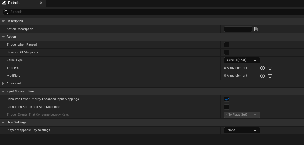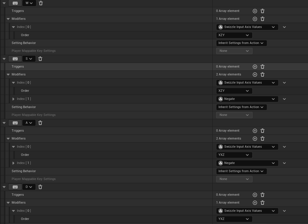 이부분이 작동을 하지 않았던것이다. 하지만 trigger는 키를 입력하는것이 맞기 때문에 문제가 아니었다. 그리고 IA와 IMC를 다시 살펴보다가 IMC에서 modifiers 제거 한 후 실행해보니 정상적으로 맵핑이 호출되는것을 확인 할 수 있었다. 때문에 SwizzleAxis 와 1D 입력방식에대해 다시 찾아보니 SwizzleAxis 같은경우는 축을 재배치하는것이기때문에 입력값이 2D나 3D인 벡터에 한하여 동작하게끔 되어있다고한다. 때문에 1D float 형태로 값을 받아오던 나의 IA는 타입자체가 달라서 이벤트자체가 발생하지 않고있던것이었다. 생각해보면 1D의 경우 값을 소수점형태로 하나만 받아오기때문에 축하고는 전혀 관련이 없었던것이다.