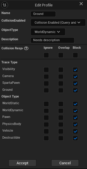 직접사용할 Pawn, Ground CollisionPreset도 만들어 주었다. 일단은 지면처리만 할것이기에 간단하게 Ground는 BlockAll 로 설정을했고 Pawn 같은경우는 본인이나 카메라와 충돌하면 안되기 때문에 해당상황을 반영해서 설정해주었다.