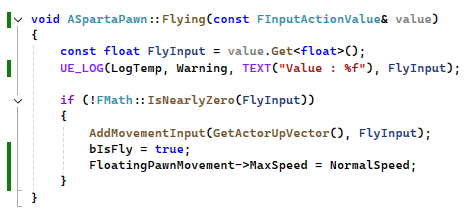 Flying : 상승과 하강을 담당하는 함수 같은경우 Z축 하나의 값만 필요로 하기 때문에 Float 형식으로 값을 받아주었다.