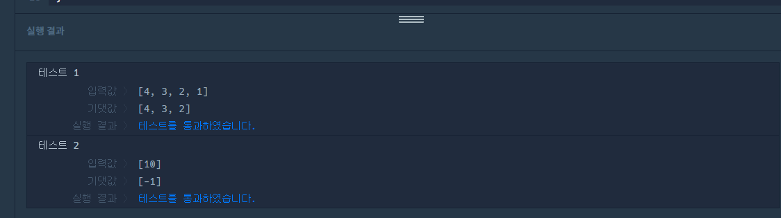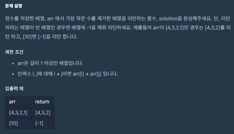 주어진 int형 배열에서 제일 작은 수를 제거하고 남은 요소들을 반환하는문제이다.
