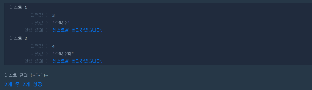 "수박수박수.." 같은 패턴으로 진행되는 문자열 존재, 정수 n이 주어질 때 n이 4이면 "수박수박" 3이면 "수박수" 리턴하기