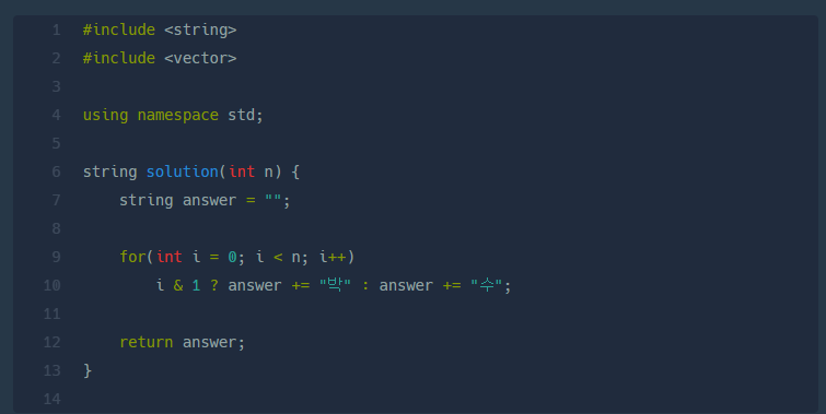 문제풀이 : 인덱스 0부터 n - 1 까지 도는 반복문에서 각 반복마다 인덱스와 1을 비트연산자를 통해 판단후 참일경우 "박"을 반환 거짓일경우"수" 를반환 한다. 1은 이진수로 표현할경우 0000...0001이고 홀수의 이진수의 경우 마지막 자리가 항상 1이다. 해당 규칙을통해 1과 홀수를 & 연산할경우 홀수일경우에만 참이므로 "박" 반환 그외에 모든경우에는 "수"를 반환하기때문에 식이 성립하는것이다.