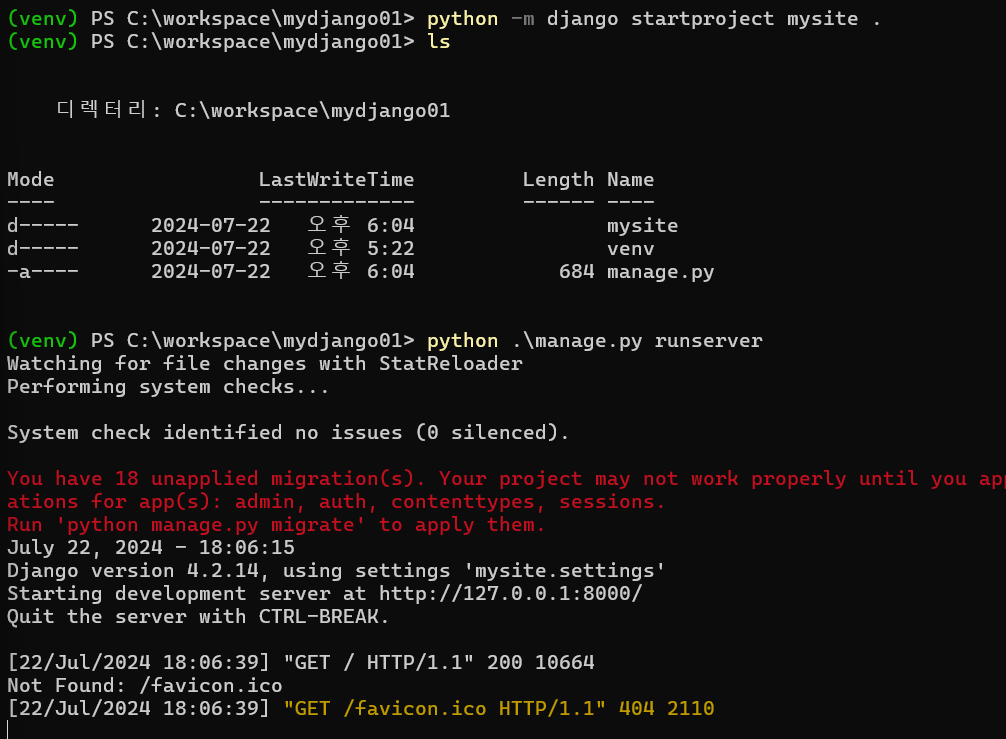 ctrl + c : 서버 종료python -m django startproject mysite . # 점은 현재위치, 꼭!