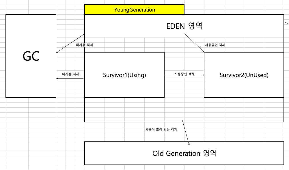 Young영역의 구조에는 두 가지 총 세 가지 영역이 더 있다. (Eden 영역 / Survivor 영역(2) )