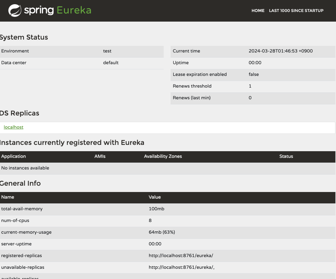 서버가 여러개 띄워져 있을 때 이를 관리할 수 있는 그런 서비스이다. Gateway도 여기서 관리할 수 있다. 의존성으로 SpringCloudNetflix discovery 서비스를 등록해서 해당 서버의 uri를 다른 서비스의 설정에 등록해주면, SpringCloudNetflix discovery 서비스의 uri로 들어갔을 때 아래와 같은 화면을 볼 수 있다.