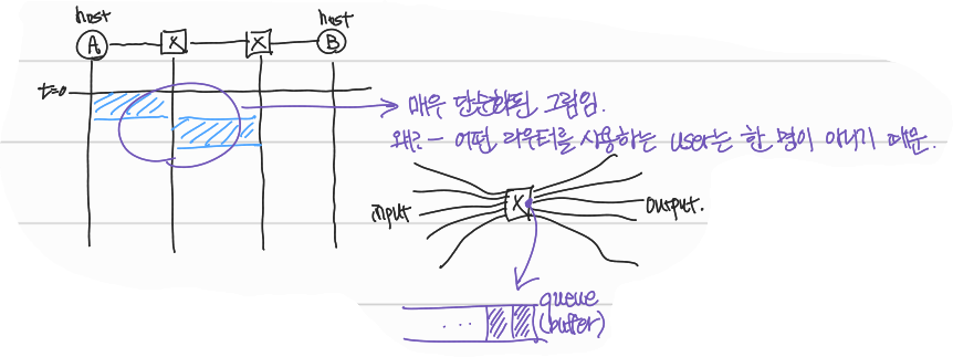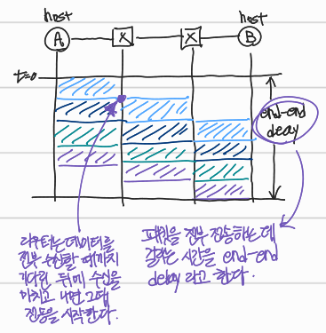 - end-end delay: propagation delay를 고려하지 않으면, 위 그림에서의 end-end delay는 2L/R이다