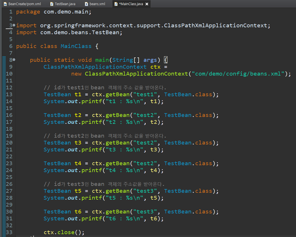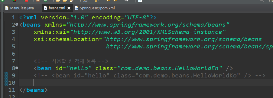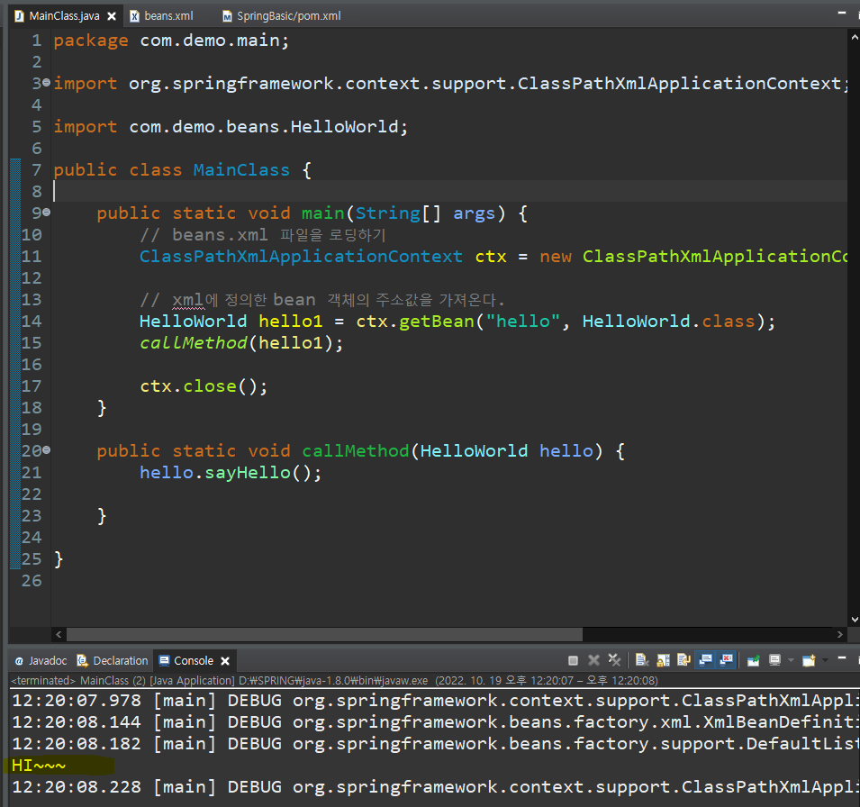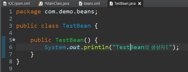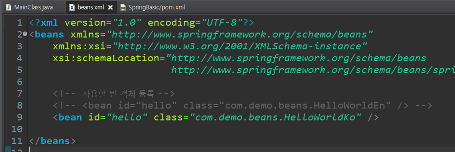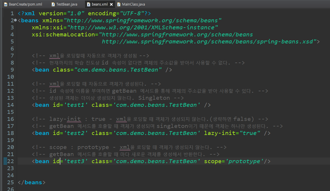 beans.xml 파일에서 빈 객체를 등록하면 객체가 프레임워크에 의해 스스로 생성됨